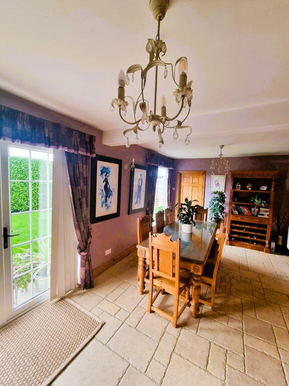 Upon entering, the sense of space and quality is immediately apparent. The formal living room is both refined and inviting, featuring solid wood flooring, an open fire with a striking marble surround, and dual-aspect windows that bathe the room in natural light. A separate formal dining room, seamlessly connected to both the hallway and living room, provides an elegant setting for entertaining, with double doors opening onto the rear garden, perfect for indoor-outdoor living.